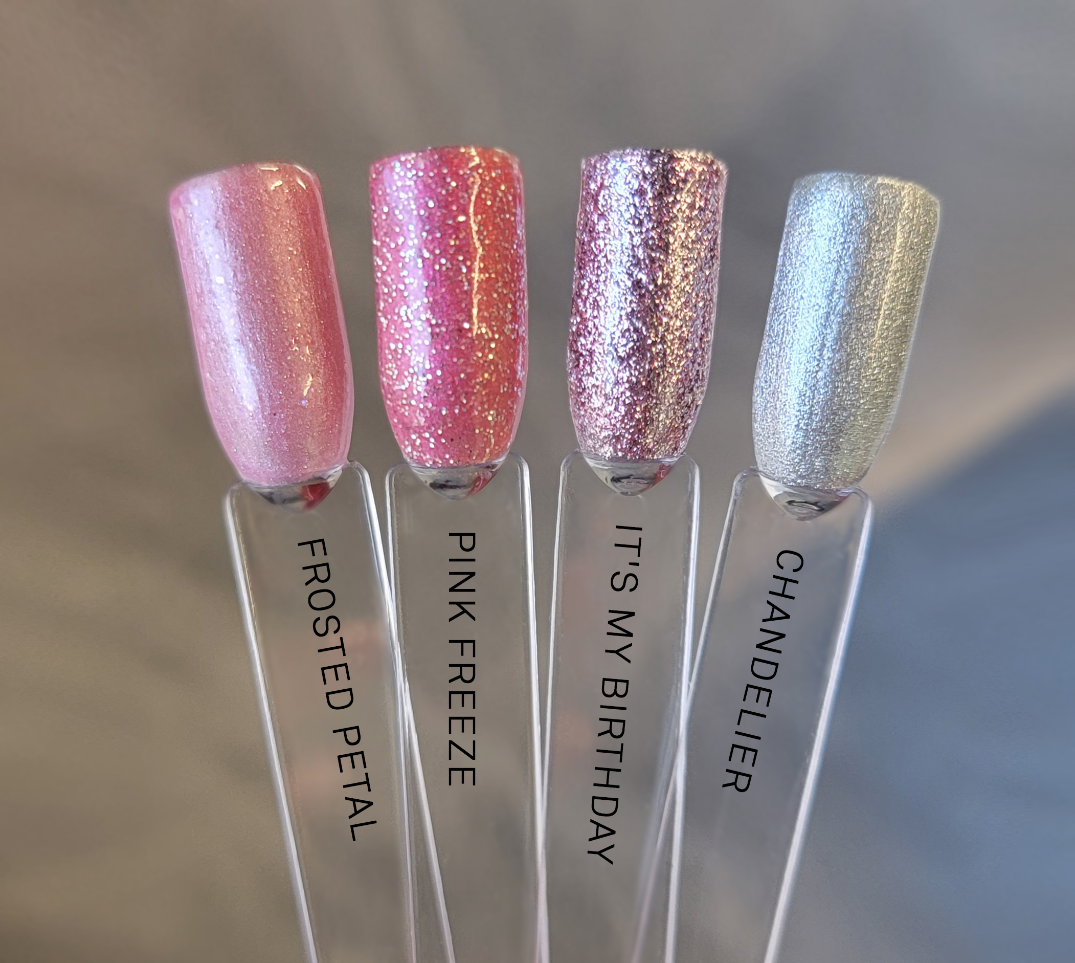 Silver rose. Metallic foil sparkle. Opaque. Cool undertone.