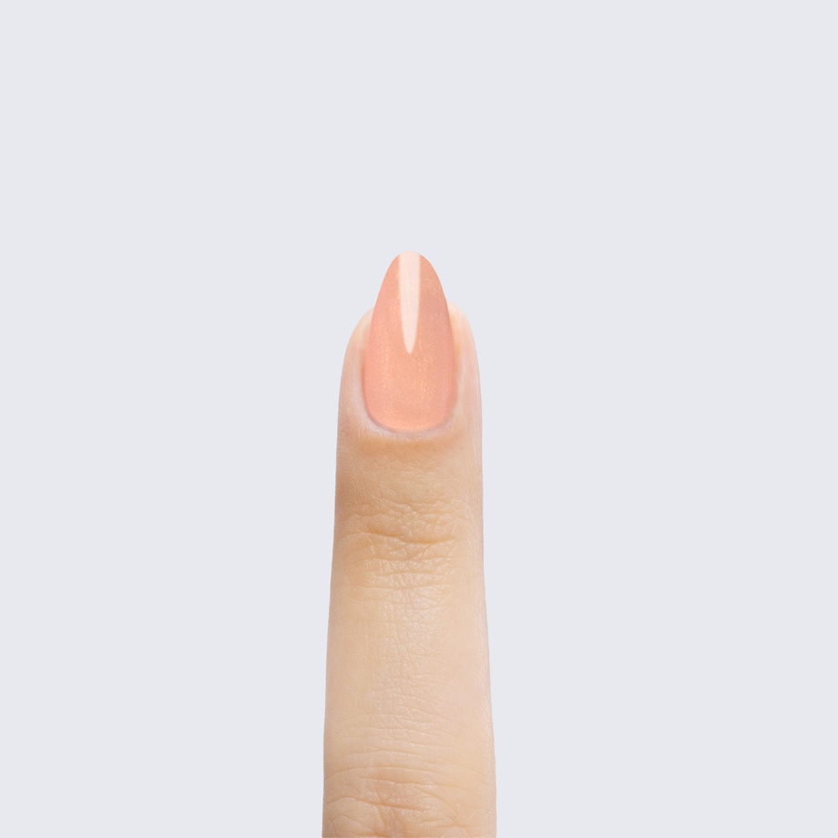 Pale muted peach. Pearl finish. Golden iridescence. Opaque. Warm undertone.